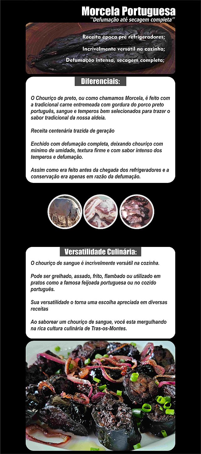 A Morcela Transmontana é um chouriço de sangue que celebra as tradições gastronômicas da região. Elaborada com carne suína entremeada com gordura do nobre porco preto português, sangue, cebola, e uma cuidadosa seleção de especiarias, esta morcela oferece um sabor rico e autêntico que remete ao passado da culinária portuguesa.