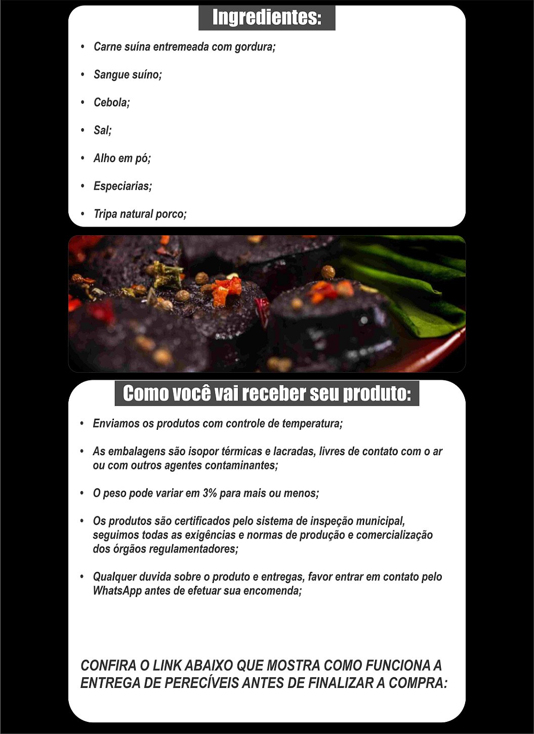 Ingredientes: Carne suína, sangue suíno, cebola, sal, alho em pó, especiarias selecionadas, tripa natural de porco